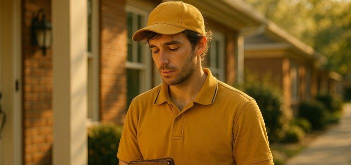 Han sto ved døren til et stort hus og holdt en slitt lærlommebok i hendene. Morgensolen var akkurat i ferd med å stige opp og badet gaten i
