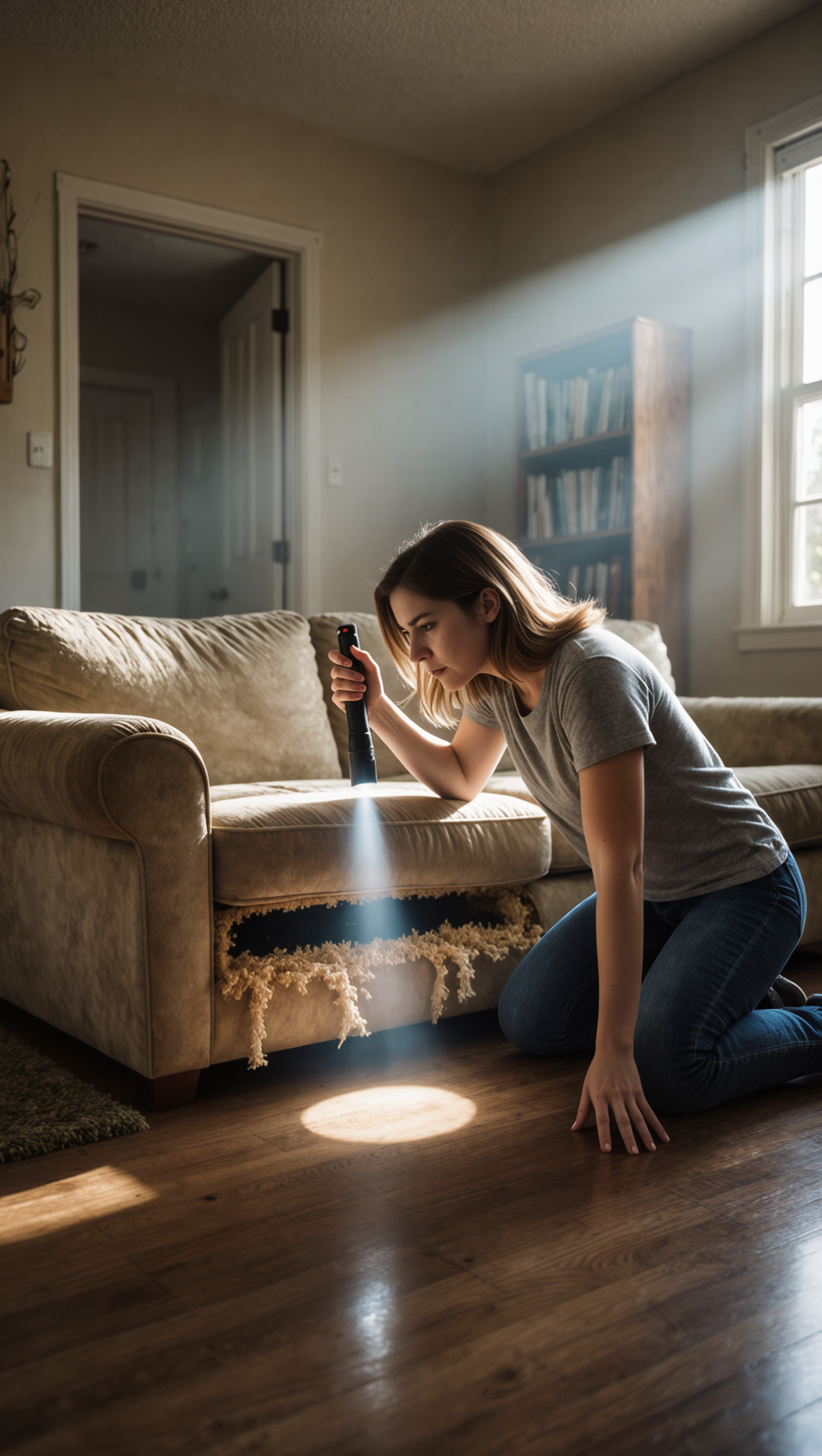 Noen dager senere begynte hun å høre lyder. Svake skrapelyder, svake raslinger, alltid fra sofaen. Jessica antok at det var en mus som hadde krøpet inn i den. Fast bestemt på å ta tak i det, åpnet hun putene og kikket inn med en lommelykt. Ingenting.