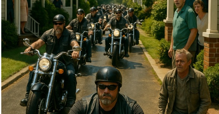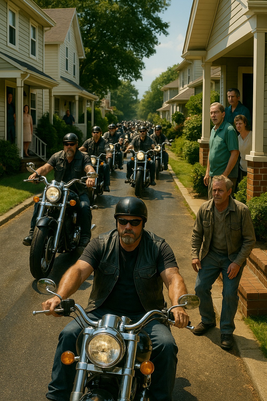 Naboene kikket ut fra verandaene og hvisket nervøst. Noen tok frem telefonene sine. Ingen forsto hvorfor en hel motorsykkelklubb hadde rullet inn i deres rolige nabolag.