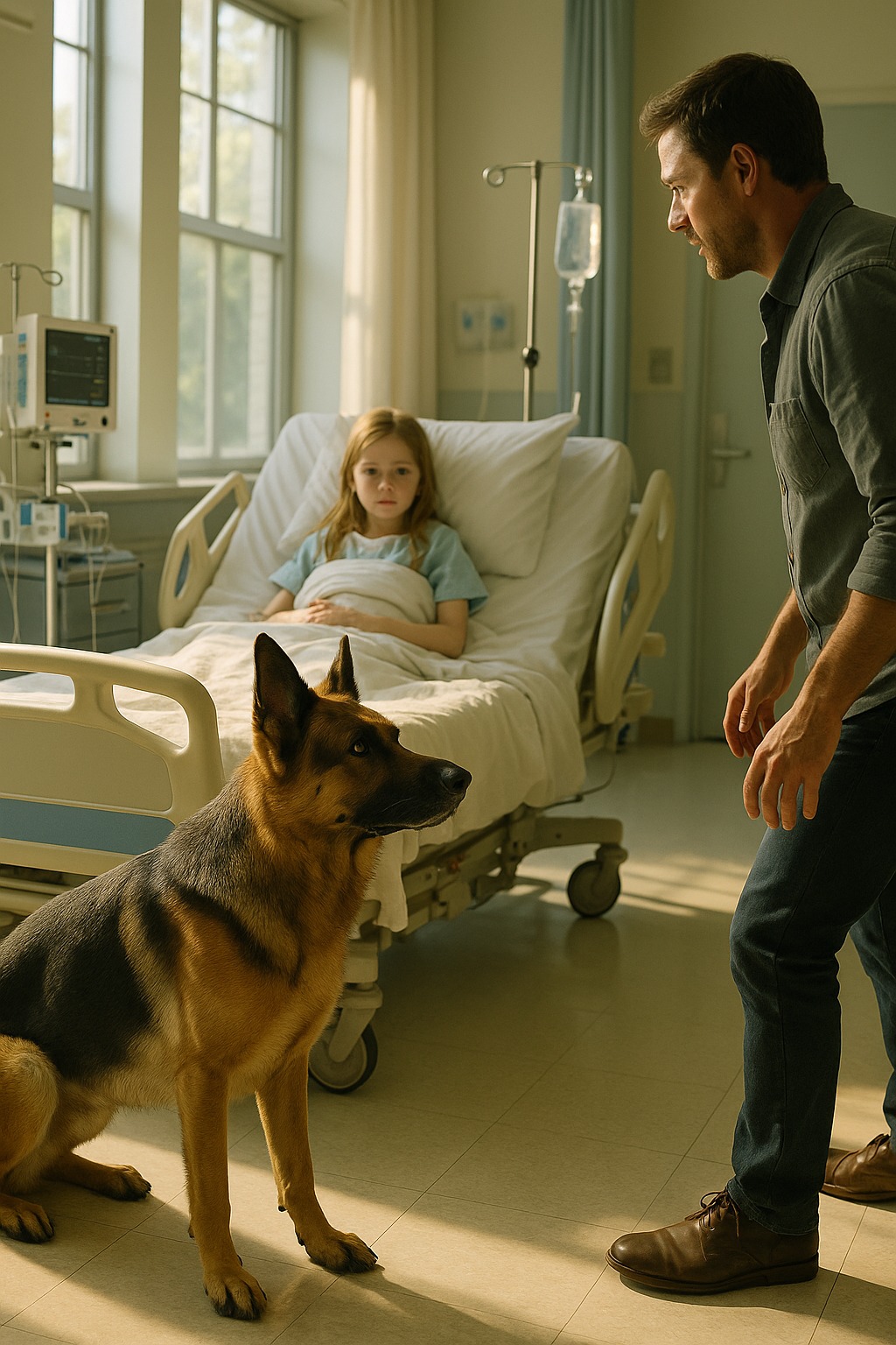 Da han kom til barneavdelingen, stoppet han brått. En stor schæferhund sto stivt foran en av dørene. Pelsen glinset i lyset fra lysrørene, øynene var skarpe og urokkelige. Hunden knurret lavt og truende, og lyden vibrerte gjennom den sterile korridoren. Thomas stivnet, frykt og frustrasjon blandet seg.
