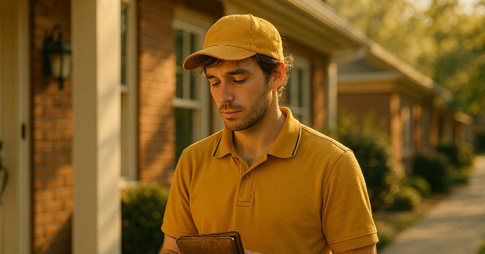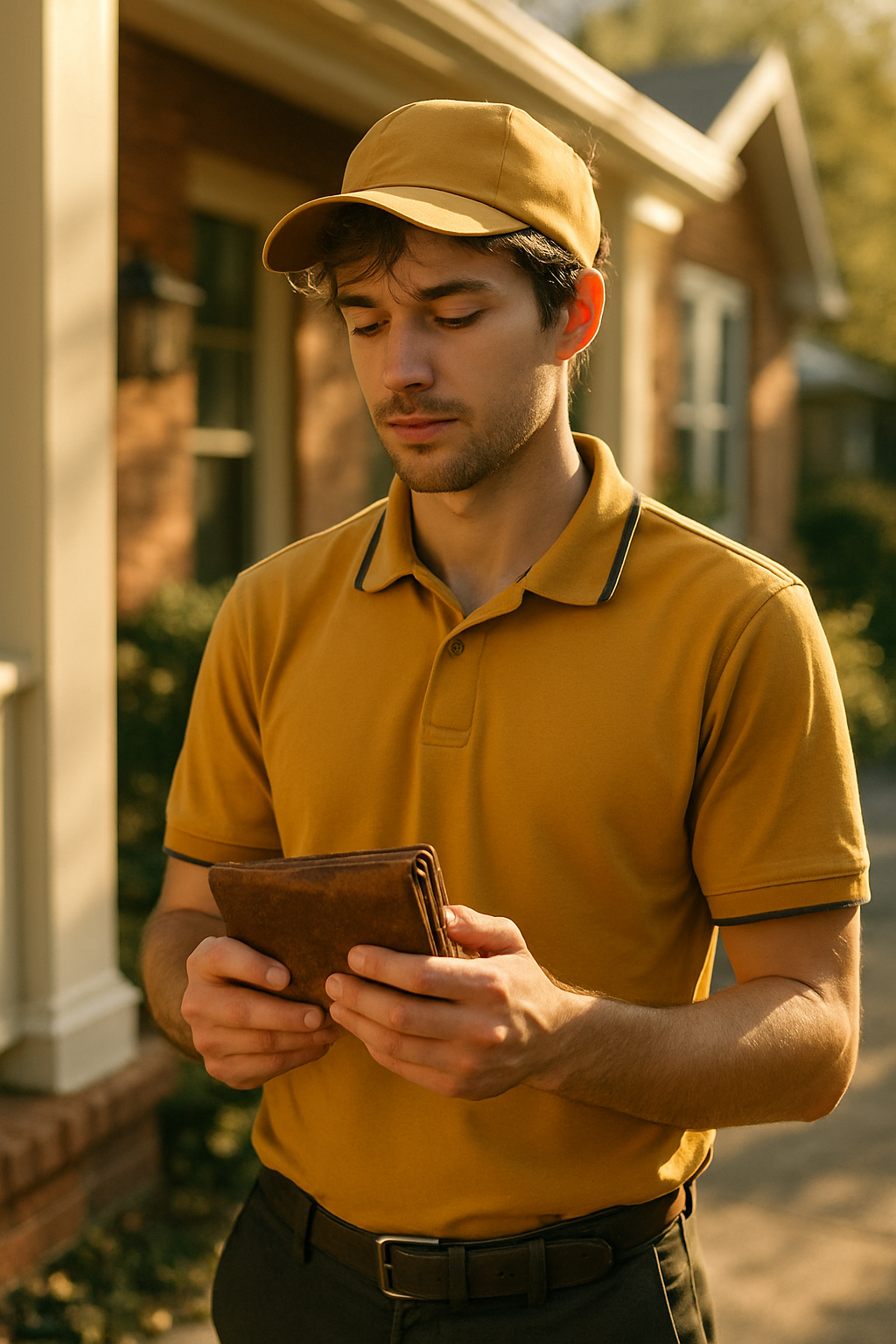I går kveld, mens han leverte en ordre, falt lommeboken hans fra setet ved noens inngangsdør. Han oppdaget det først om morgenen, da han skulle til å dra ut på ruten sin. Inni var det penger, dokumenter, flere gamle sjekker og et fotografi av en kvinne med en gutt.