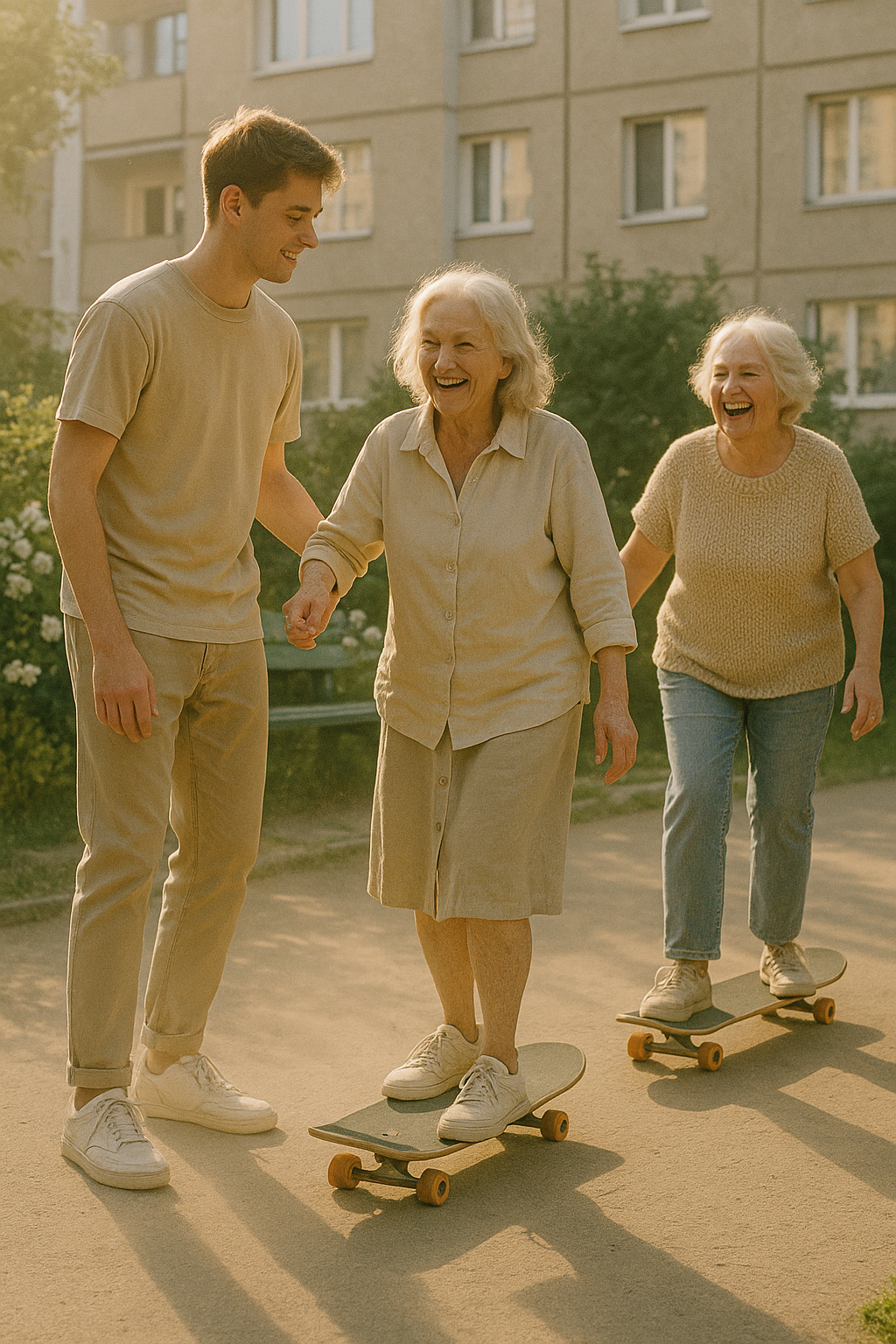 Gårdsplassen der Lucas skøytet med vennene sine var bare bråkete om kveldene. Om dagen var den tom: gamle benker, duer, bestemødre og stramme bemerkninger om været. Han akselererte over den glatte betongen, utførte et triks, fløy like over bakken – og følte seg levende.