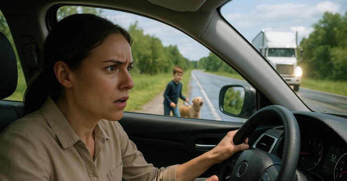 Hjertet hennes ga et kort rykk. Det uforklarlige – ikke frykt, ikke angst, bare en følelse som om tiden hadde snublet. Laura bråbremset. Bilen stoppet midt i veien, mykt, med den stille lyden av dekk på den våte veien.