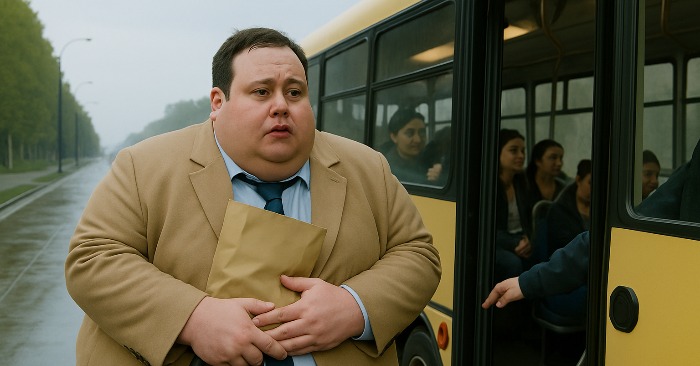 Martin sto på bussholdeplassen med kofferten sin og en papirpose med smørbrød. Skjorten hans var anstrengt, kragen var stram, armhulene var fuktige – som vanlig.