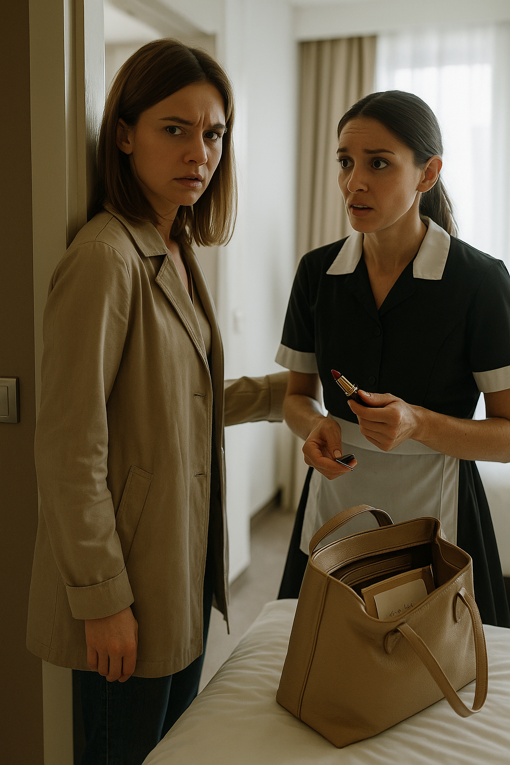Hushjelpen sto i rommet. En ung kvinne i uniform med vesken åpen på sengen. I hendene hennes hadde hun Lenas leppestift og nøkkelkort.