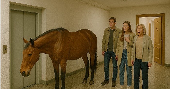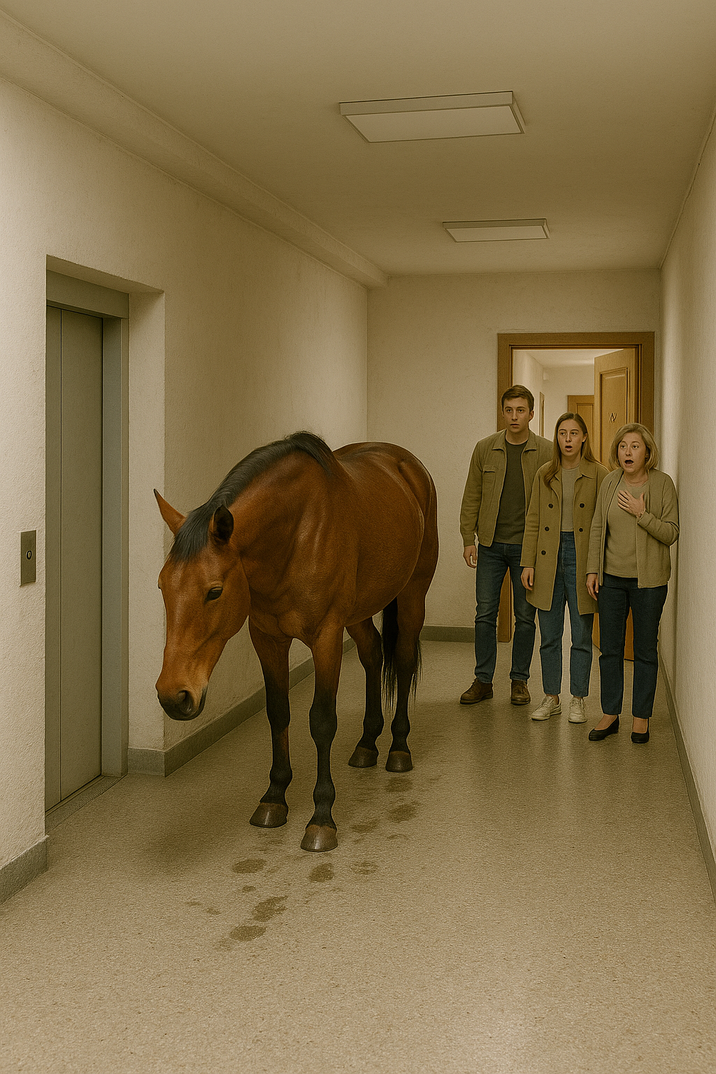 Den viste en hest. En vanlig brun hest. Den sto ved heisen i syvende etasje i en bygård, beveget forsiktig hovene og så på dørene, som om den ventet.