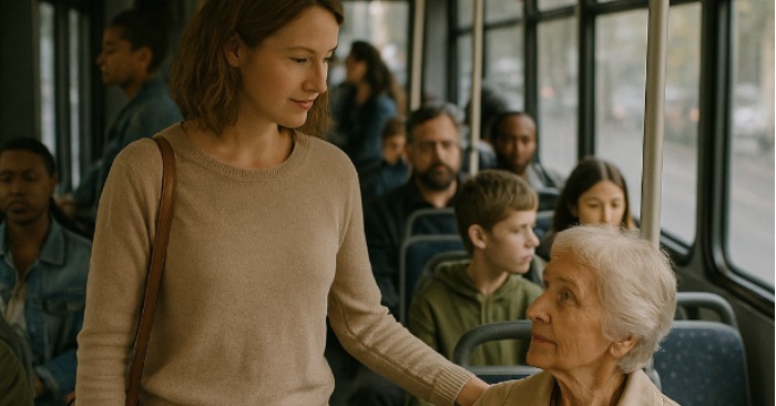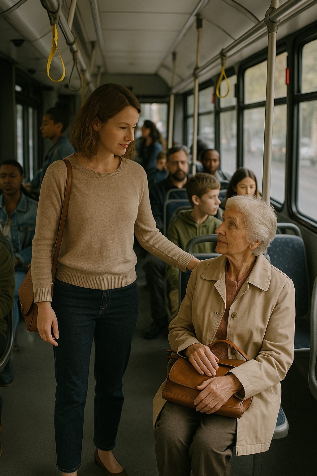 Bussen var overfylt. Det var kveldsrushet, og folk var slitne og irriterte. Noen bar vesker, noen bar telefoner, og noen prøvde rett og slett å ikke tråkke andre på tærne. Anna, som hadde hastet hjem fra jobb, klemte seg endelig inn, grep tak i rekkverket og telte mentalt stoppene til hun kom hjem.