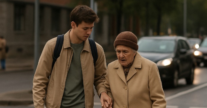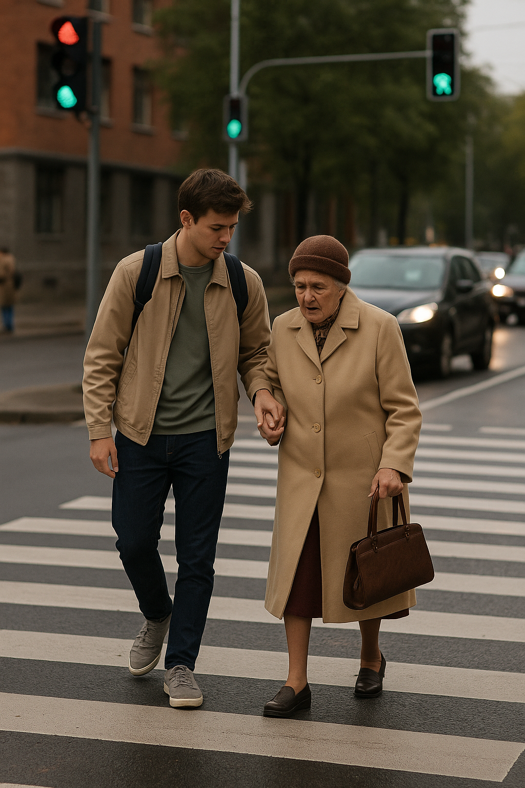 Men i neste kryss, rett foran ham, sto en eldre kvinne med stokk. Trafikklyset blinket allerede grønt, og sjåførene begynte utålmodig å tute. Den gamle kvinnen tok forsiktig et skritt fremover, men frøs til. Alex kikket irritert på klokken sin, deretter på veien – og i stedet for å gå rundt henne som de andre, tok han av seg hodetelefonene og gikk bort.