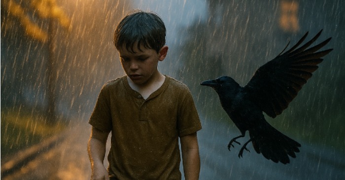 Og så landet en kråke ved siden av ham – våt, skinnende, svart, med dråper på vingene.