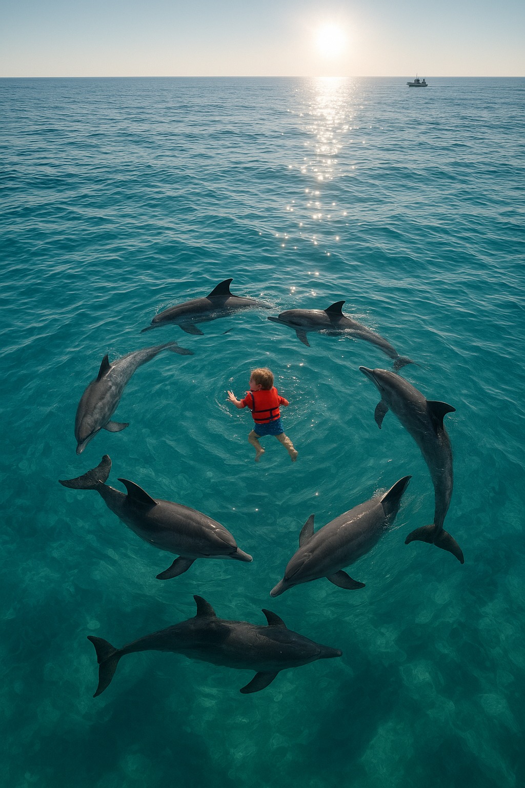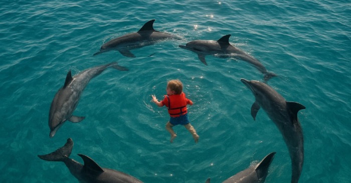 De lot ham ikke gå under vann. En delfin svømte opp fra under, som om den presset barnet opp, mens en annen virvlet rundt og skapte bølger som holdt ham flytende. Resten beveget seg i en sirkel, som om de beskyttet ham mot noe usynlig.