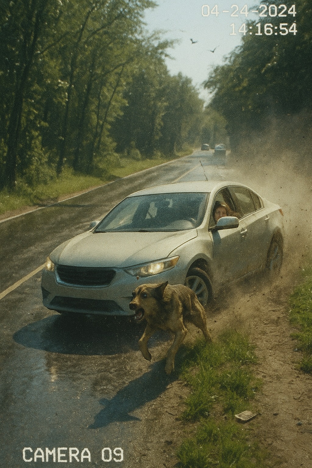 Opptakene viser en hund som løper ut fra siden av veien. Tynn, med skitten, sammenfiltret pels, et revnet halsbånd og våkne øyne. Hun løper rett ut på veien, som om hun er i panikk.