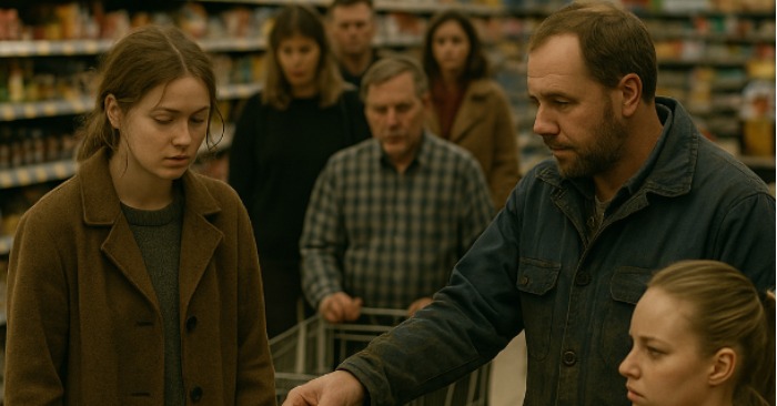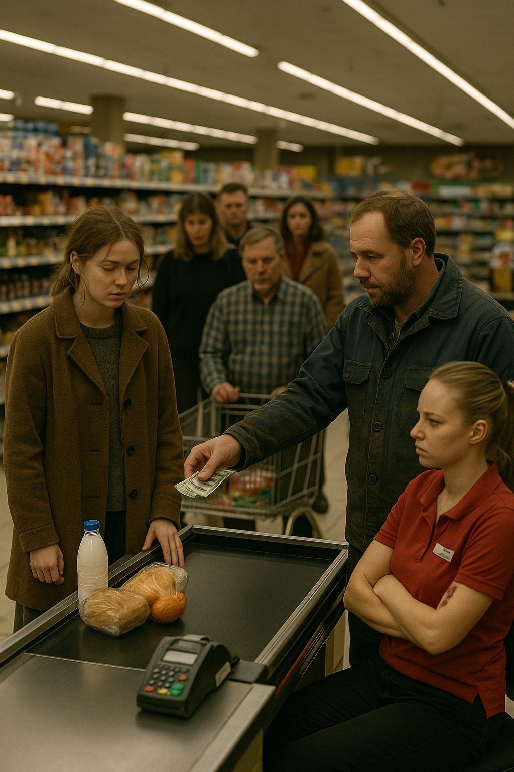 Køen i supermarkedet gikk sakte fremover. Folk sto trøtte, noen scrollet gjennom telefonene sine, andre flyttet nervøst varene fra hånd til hånd. En ung jente sto nær kassen – i en slitt frakk, gamle sko og med uflettet hår. Hun hadde ikke sminke, bare tretthet og en lett forvirring i øynene.