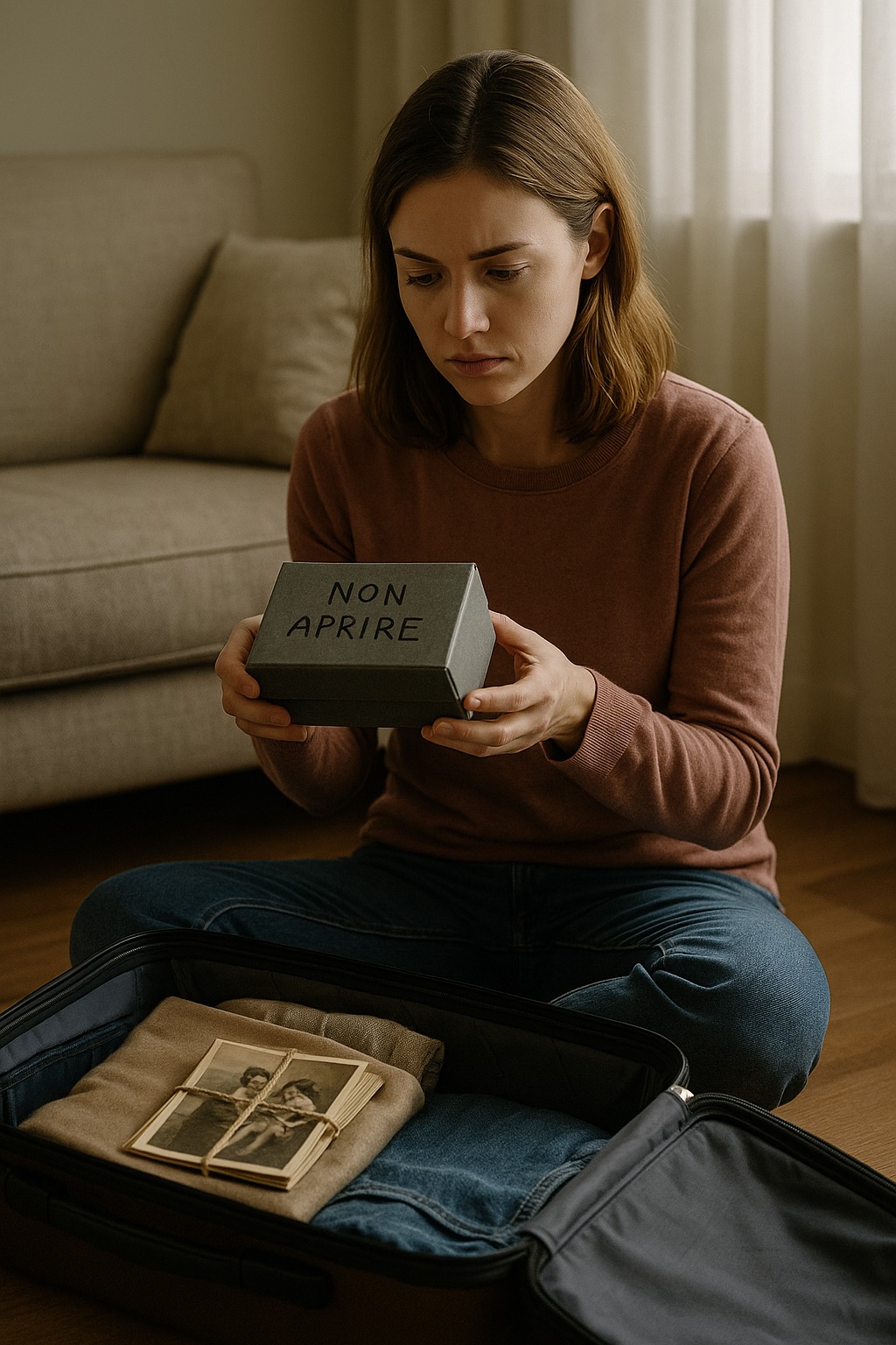 Hjemme åpnet hun kofferten og innså at innholdet ikke var hennes. I stedet for genseren og kameraet hennes, lå det pent brettede herreskjorter, en bok på italiensk og en eske merket «Non aprire» – «Ikke åpne».