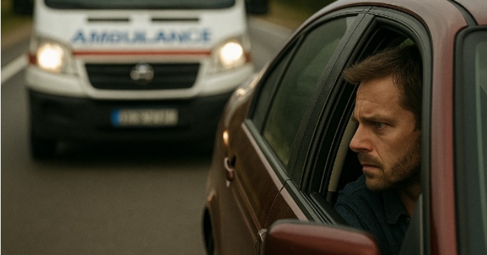 «Hvorfor er dere alle i veien?» mumlet han og svingte skarpt uten å tenke seg om, og kuttet av ambulansen.