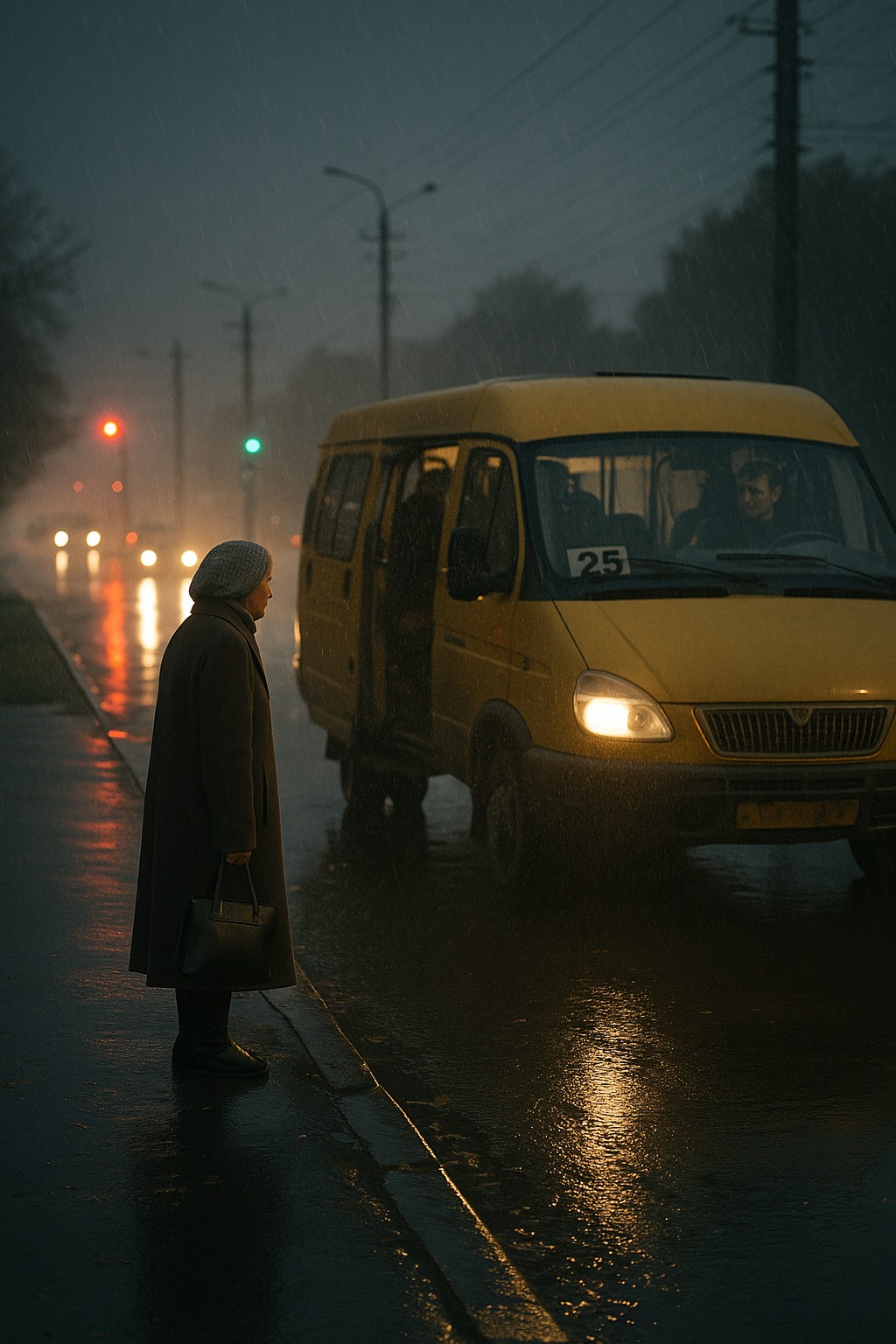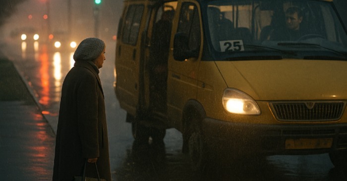 Regnet kom plutselig — kraftig, kaldt, høstlig. Veiene ble mørke, folk gjemte seg under paraplyer, busser og minibusser kjørte saktere enn vanlig. Maria sto ved bussholdeplassen og klemte vesken og skjerfet sitt. Hun var sen på jobb – datteren hennes hadde følt seg uvel den morgenen, så hun måtte være sammen med henne lenger. Nå hadde hun det travelt, var nervøs og ble våt i regnskyllet.