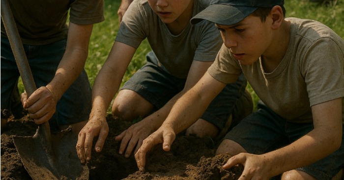 De takket gjerne ja. De tok spader og begynte å grave. Bakken var myk og fuktig etter den nylige regnen. Latter, samtaler – alt var rolig og enkelt. Men etter en halvtime traff Erics spade noe hardt. Lyden var dump og metallisk.
