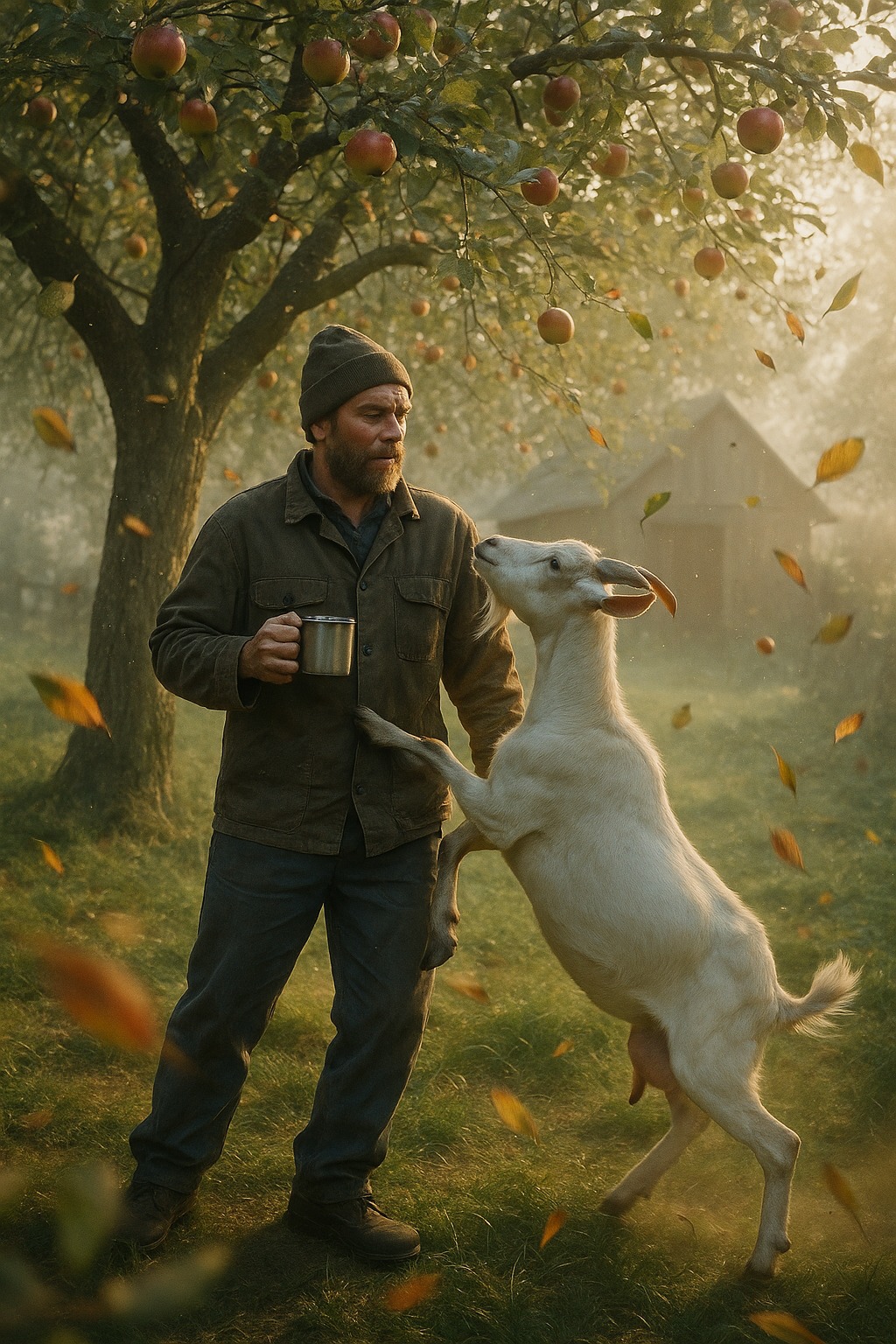 Det luktet juice, knuste epler og liv. En lett bris rørte bladene på de fallne grenene, og solen lekte med glimt i pelsen hennes. Han satt og så på treet og tenkte –
