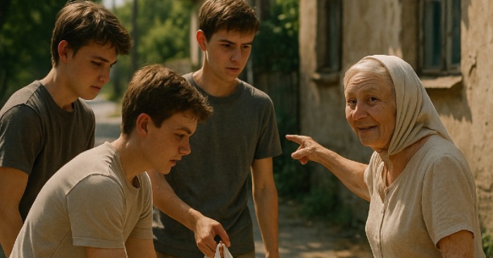 Det var en varm lørdagskveld. Alex, Tom og Nick var på vei hjem fra fotballbanen, og lo og kranglet om hvem som hadde scoret flest mål. I krysset kom en eldre kvinne i lang frakk bort til dem, med en stokk i hånden og to tunge papirposer. Hun så trøtt ut, men snakket mykt og selvsikkert.