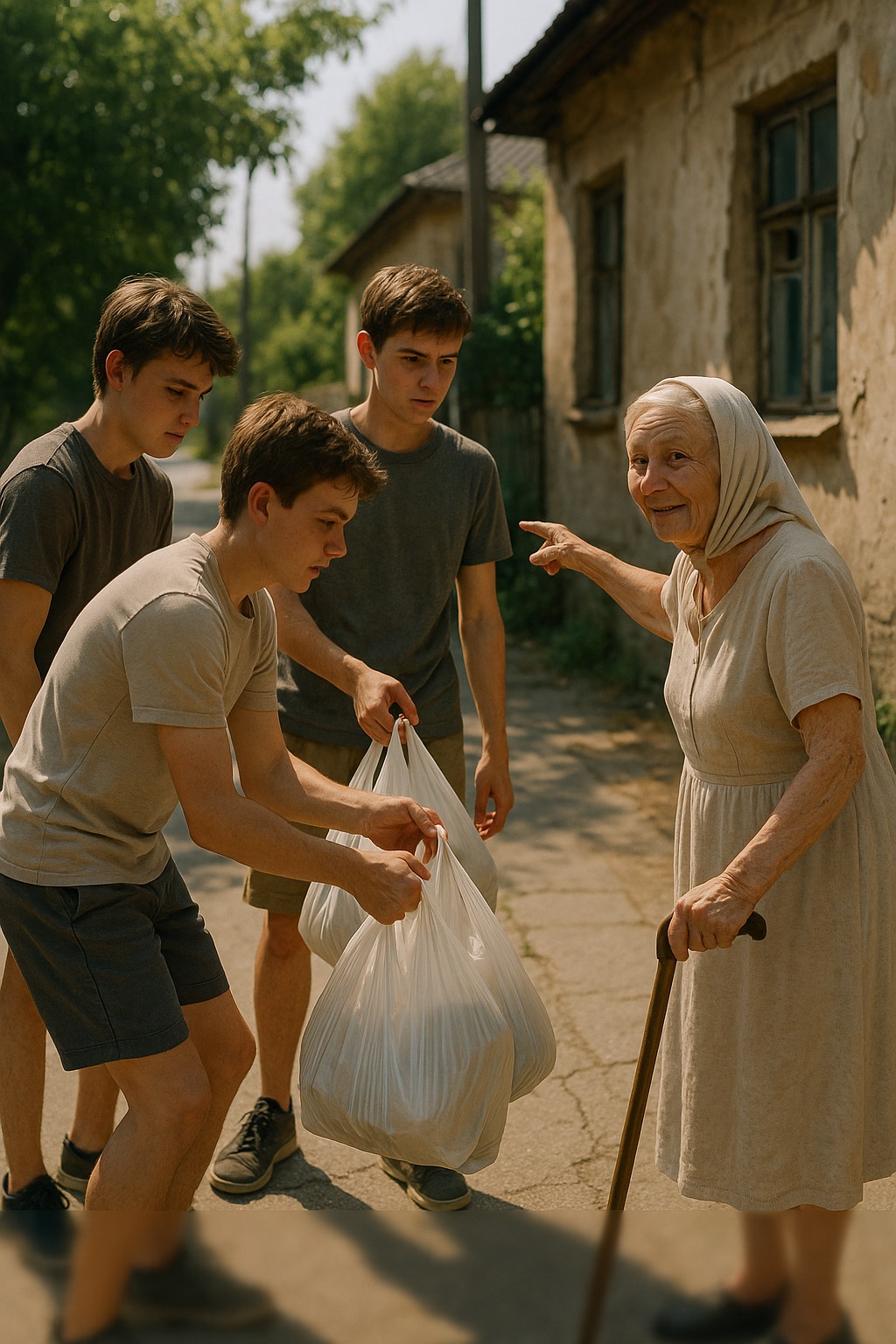 «Gutter, kan dere hjelpe meg å bære disse posene hjem?» spurte hun. «Jeg bor veldig nær her, men det er vanskelig for meg å gå.»