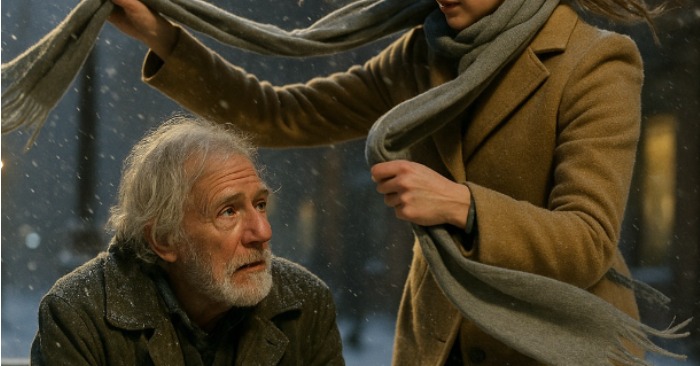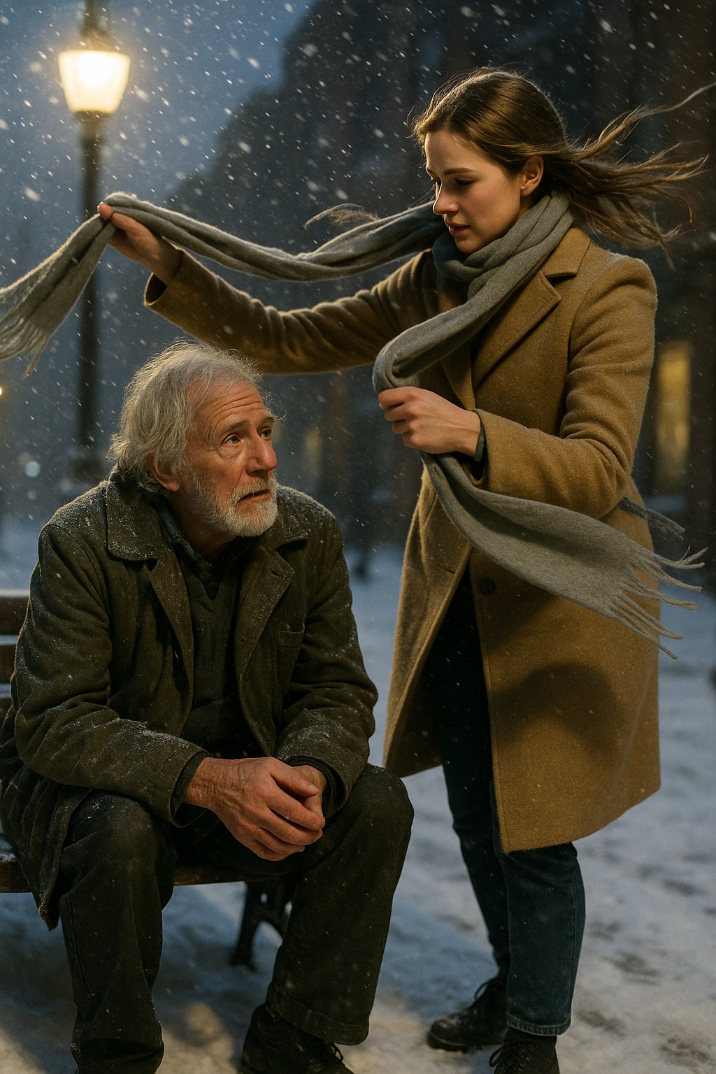 En gammel mann satt ved bussholdeplassen, rett ved siden av søppelkassen. Han hadde på seg en tynn regnjakke og revne støvler, og hendene hans skalv av kulden i lommene. Ansiktet hans var dekket av snø, øynene nedadvendte, leppene blå. Ingen stoppet. Alle gikk forbi.