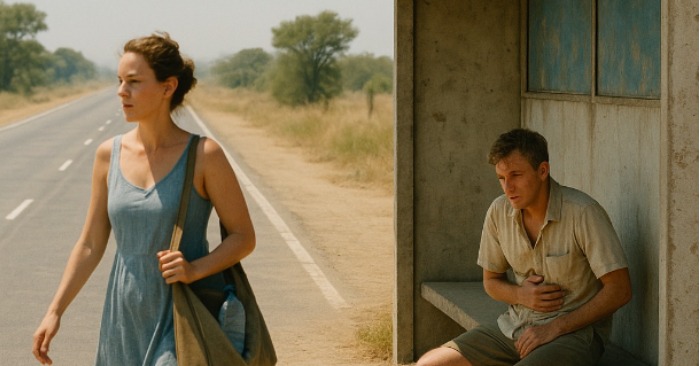 En ung mann, rundt tjuefem år gammel, satt ved bussholdeplassen. Solen stekte ned på ansiktet hans, skjorten var gjennomvåt av svette. Da hun nærmet seg, så han opp og sa stille: