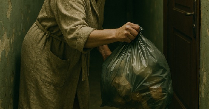 Hun dumpet posen med et brak rett under dørmatten hans. Rester, papir, skitt. «La ham få vite at alle er lei av ham», tenkte hun, fornøyd med seg selv.