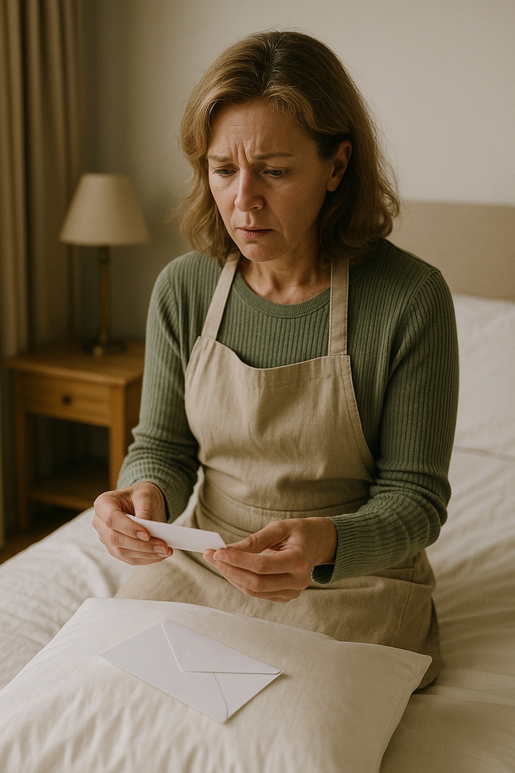 Neste dag var huset stille. For stille. Uten lyden av støvsugeren, uten lukten av renslighet. Laura bestemte seg for at hun ville venne seg til det. Men da hun gikk til soverommet sitt om kvelden, så hun en konvolutt på puta si.