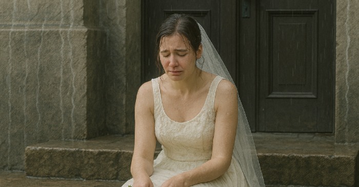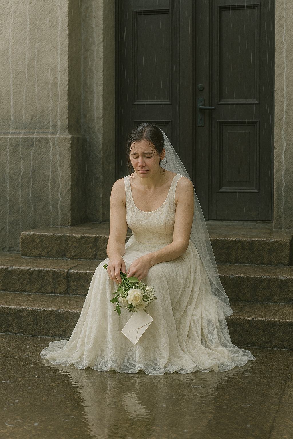 Hun sto ved døren til folkeregisterkontoret, kledd i en hvit kjole som nå lignet vått papir – tynn, skjelvende, nesten gjennomsiktig. Regnet øste ned som om himmelen hadde bestemt seg for å vaske bort hvert eneste snev av håp. Stoffet klistret seg til huden hennes, krøllene hennes ble til mørke tråder, og dråper rant nedover ansiktet hennes – enten regnvann eller tårer. Fragmenter av blomsterblader glitret på trappetrinnene under føttene hennes – hvite roser spredt ut som uuttalte ord.