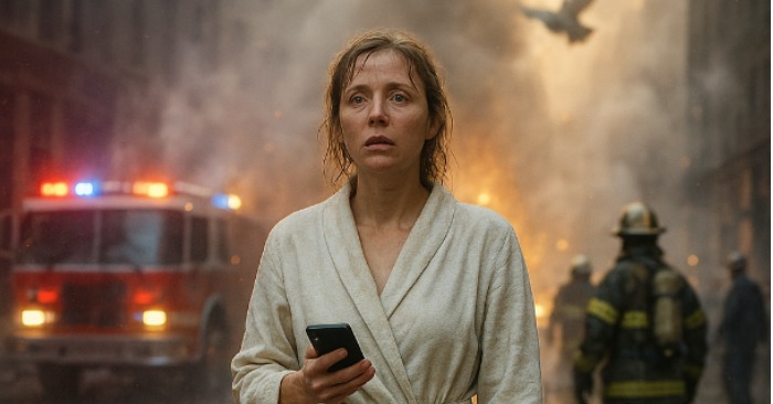 Hun løp ut på gaten, uten å føle kulden, barbeint, i morgenkåpen. Luften luktet av brennende plast og metall. Folk løp mot den svarte røyken – noen med telefoner, andre bare med tomme blikk. Et eller annet sted gråt et barn. Et eller annet sted ropte noen et navn.