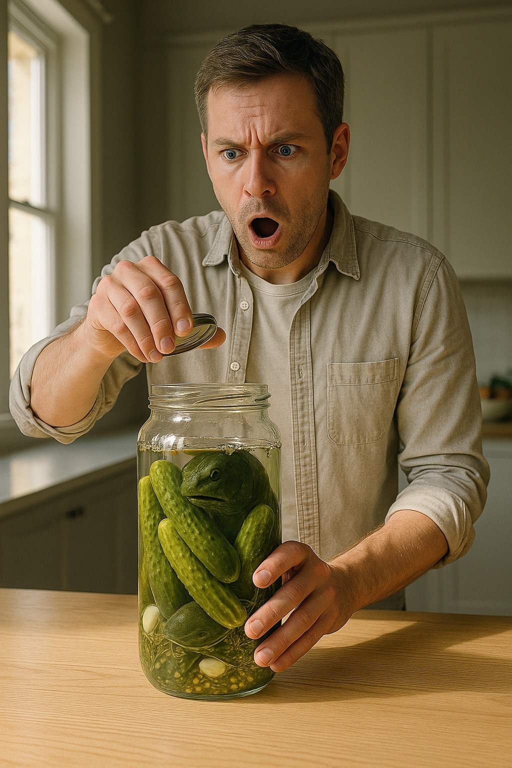 Mark satte krukken på bordet, tok en boksåpner og fjernet lokket med et lett klikk. I det øyeblikket ble han blendet av den kjente lukten av saltlake og dill. Men da han kikket inn i glasset, stivnet han. Mellom agurkene, halvt skjult av den grumsete saltlaken, kunne han se en mørkegrønn form. Først trodde han det bare var en dårlig rengjort agurk. Men da han kikket nærmere, skjønte han at det ikke var en grønnsak.