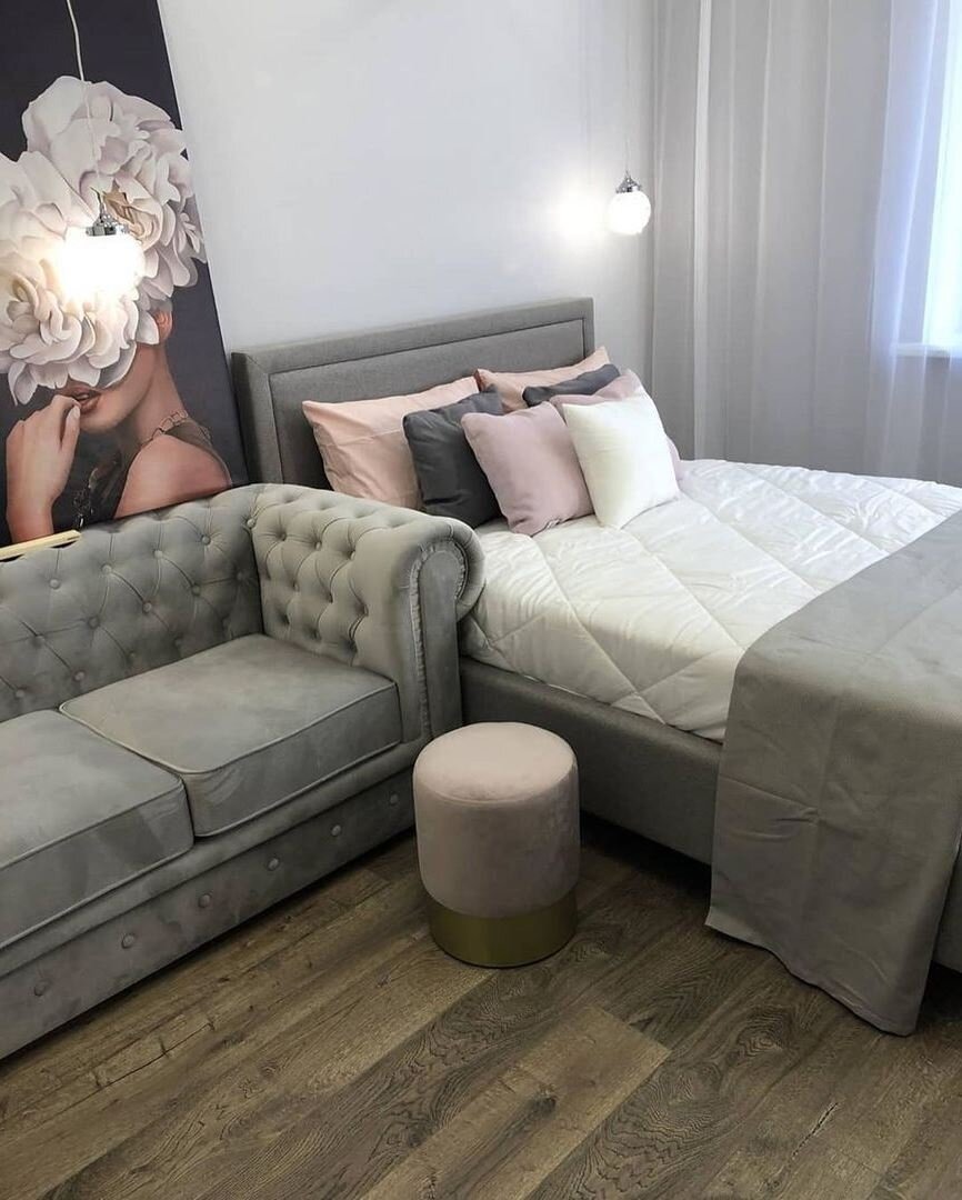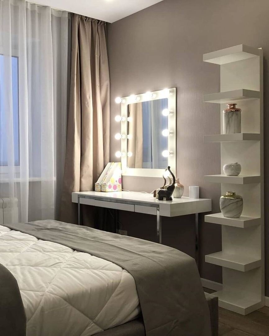 I stuen implementerte vi en ikke-standard komposisjon: sofaen og sengen ble plassert ved siden av hverandre, og skapte en enkelt avslapningsmodul. Til tross for den uvanlige løsningen ser begge elementene ensartede og stilige ut takket være identiske materialer. TV-en står overfor sofaen, og ved siden av sengen står et prosjekt jeg hadde planlagt lenge: et pent boudoirbord med speil og belysning, ideelt for oppbevaring av kosmetikk og tilbehør.