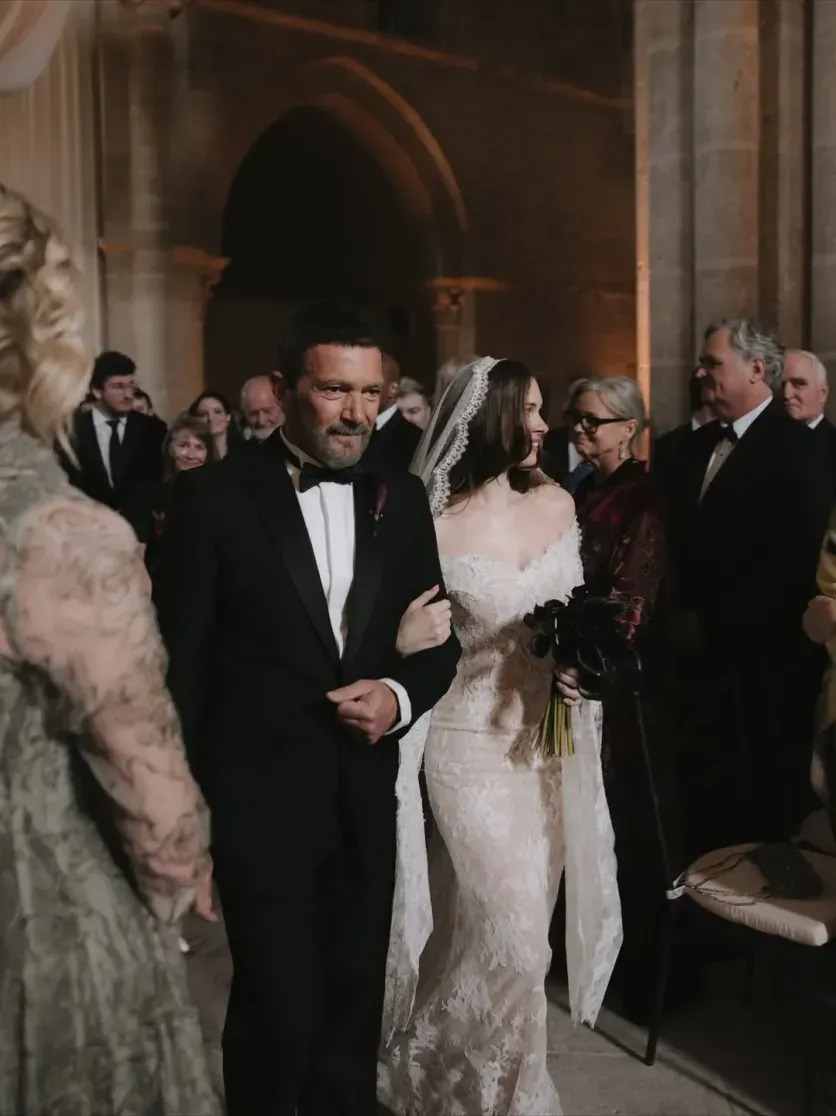 Antonio Banderas, nå 65 år gammel, fulgte datteren til alteret og innrømmet senere at han knapt kunne beherske følelsene sine. Han forlot seremonien med tårer i øynene og kalte det «et øyeblikk som er umulig å oppleve rolig». Bruden imponerte alle med sin fantastiske kjole: en luftig kjole i blonder og chiffon, laget i samarbeid med Rodarte over nesten et år, som kombinerte gotiske, romantiske og spanske tradisjoner.