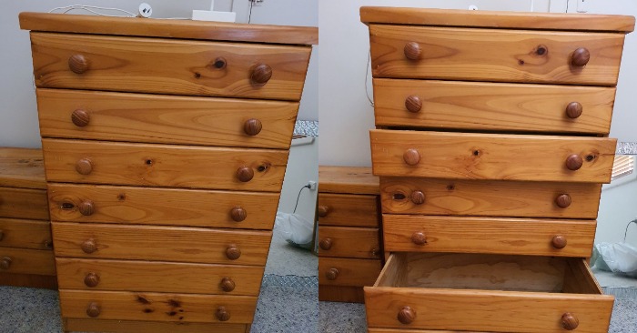 Noen elementer kom lett av, mens andre måtte skjæres ut med en skarp kniv eller fjernes med makt. Men til slutt hadde vi en solid samling av «koffert»-reservedeler, og vi kunne begynne å forvandle kommoden.