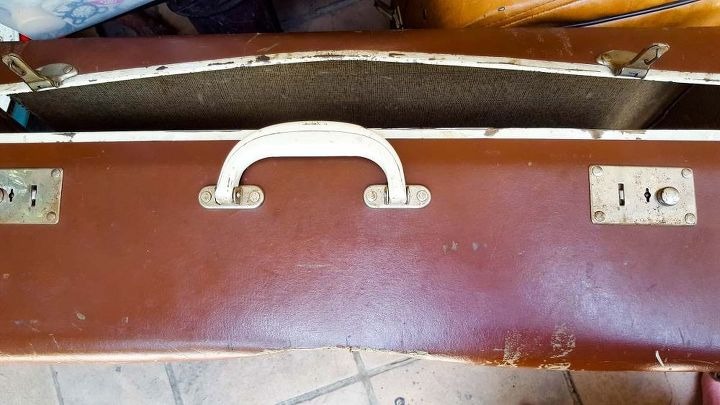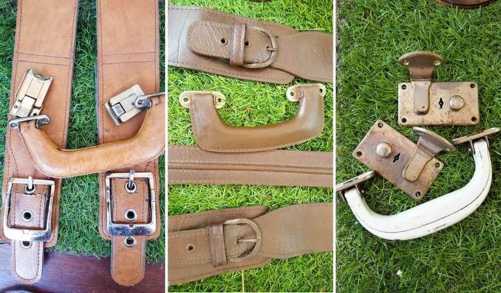 I tillegg til kommoden brukte vi en haug med gamle ødelagte kofferter kjøpt i en bruktbutikk for bokstavelig talt et par pund hver. De var i forferdelig stand – sprukket lær, revet stoff, ødelagte håndtak. Vi fant til og med et par gamle vesker. Men vi trengte dem bare som kilde til beslag: låser, håndtak, stropper og andre dekorative detaljer.