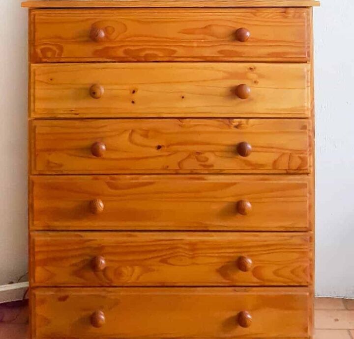 Vi fjernet alle skuffene, kvittet oss med de gamle trehåndtakene og pusset overflaten forsiktig. Deretter dekket vi den med en varm, rik trebeis – kommoden begynte umiddelbart å se mer elegant ut.