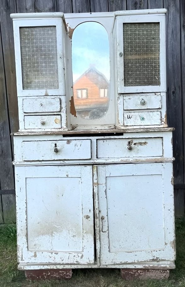 Først sjekket jeg nøye hele kroppen for råte, dype sprekker eller løse elementer. Jeg fjernet alt som kunne fjernes – dører, håndtak, skuffer – slik at jeg kunne jobbe med hver detalj separat.