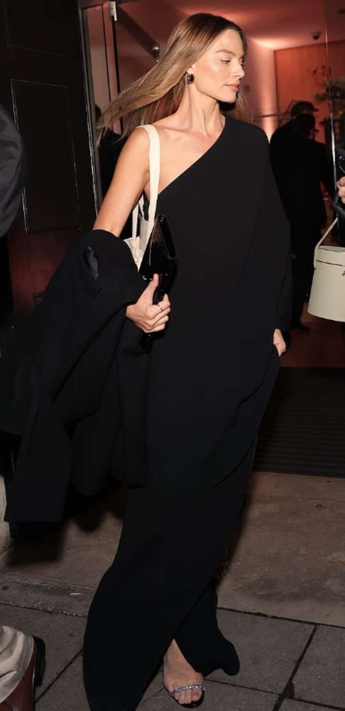 I går deltok Robbie på en gallamiddag i London, hvor hun imponerte med sin raffinerte stil. Hun valgte en lang, løstsittende svart kjole som fremhevet silhuetten hennes på en elegant måte. Asymmetrien med en bar skulder ga looken dynamikk. Antrekket ble fullført med tynne sandaler med et lett skimmer, og skuespilleren lot håret henge løst.