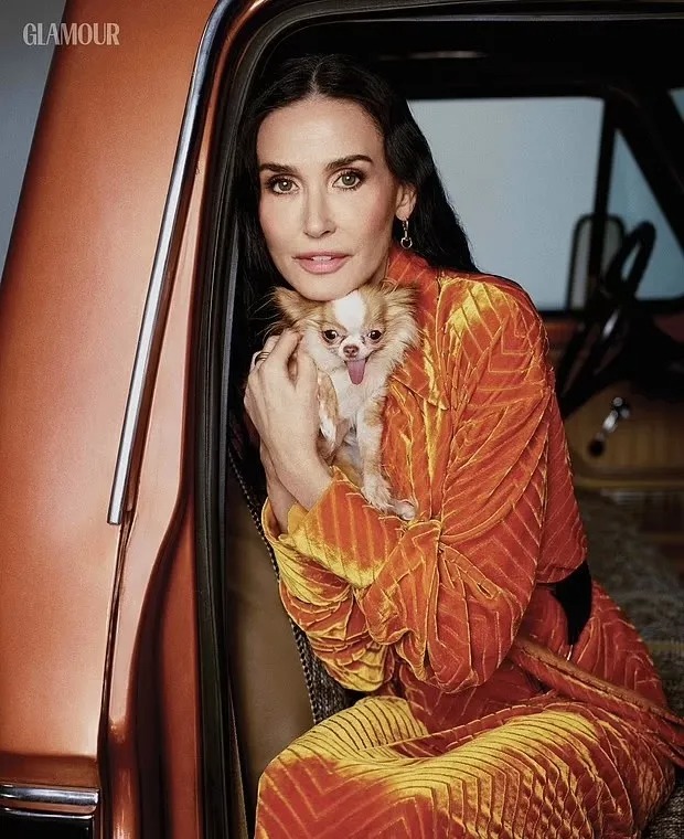 Moore poserte også i en rekke kjoler som fremhevet forskjellige sider av stilen hennes: en voluminøs svart blonderkjole, en burgunderfarget satengkjole med en dristig utskjæring i livet, en lys oransje fløyelskjole, en flytende lilla boho-inspirert kjole og en figurbetont kjole med dyreprint. På ett bilde holdt hun til og med sin elskede chihuahua, Pilar, i armene, noe som tilførte glamourøse fotograferingen varme og intimitet.