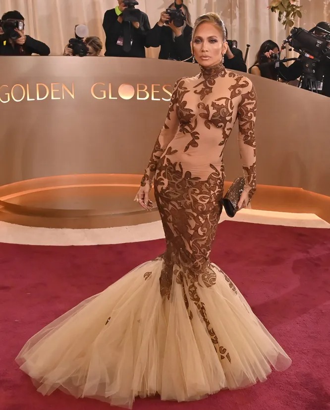 Til arrangementet som hedret film- og TV-prestasjoner i 2025, valgte Lopez en gjennomsiktig kjole av Jean-Louis Scherrer. Kjolen var laget av gjennomskinnelig stoff og lot lite til fantasien, med bare brokade-mønstre som dekket de mest avslørende områdene. En voluminøs mesh-volang fullførte skjørtet og tilførte drama til en allerede dristig silhuett.