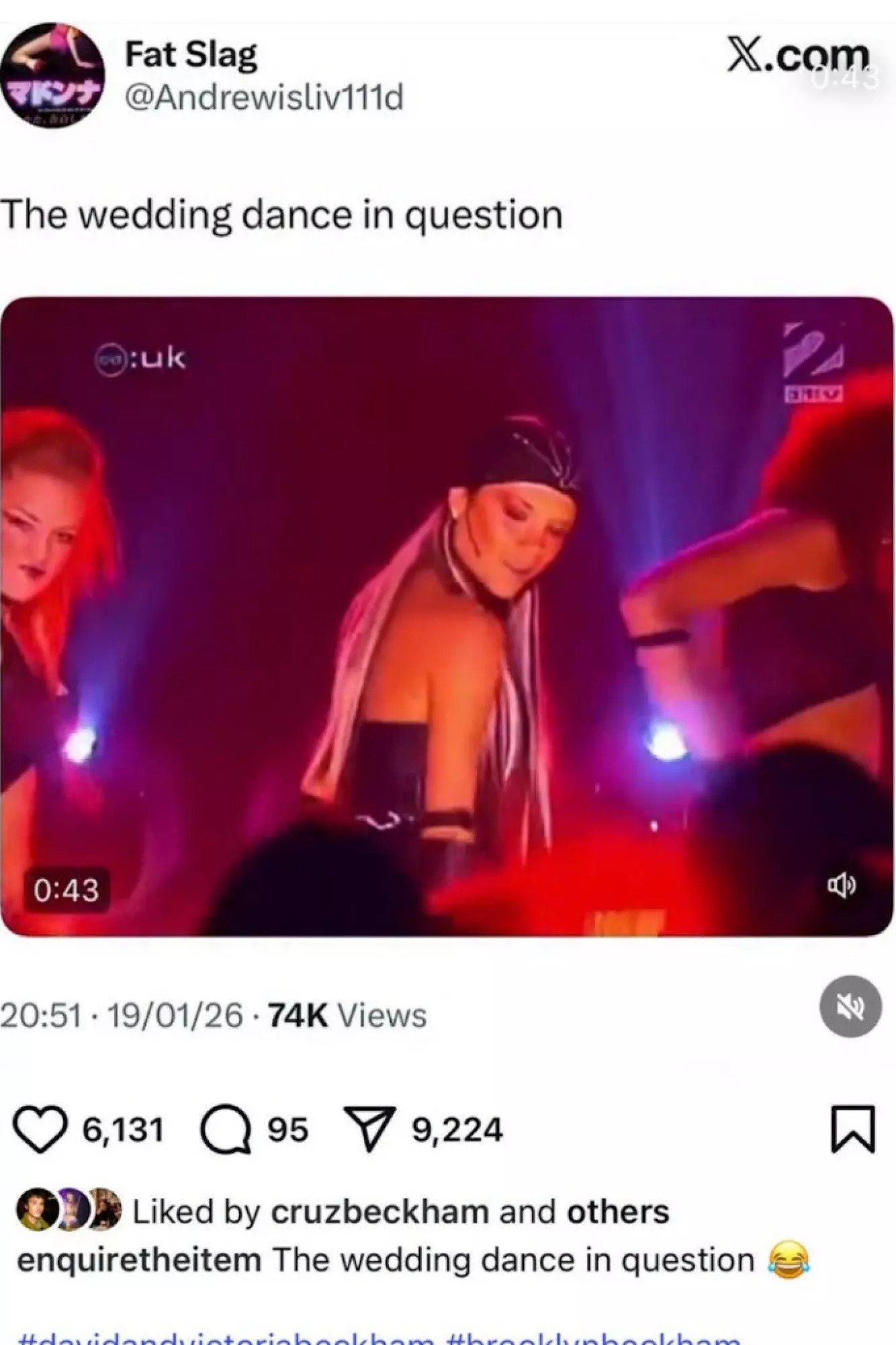 En spesiell parodi ser ut til å ha fått mye oppmerksomhet fra den yngste Beckham-sønnen, Cruz. I en video på sosiale medier får Victoria Beckham en humoristisk fremstilling der hun synger sin Spice Girls-låt fra 2001, «Not Such an Innocent Girl», iført et dristig skinnantrekk. Videoen parodierer den påståtte bryllupsdansen som Brooklyn kritiserte, og teksten lyder: «Bryllupsdansen det er snakk om.»