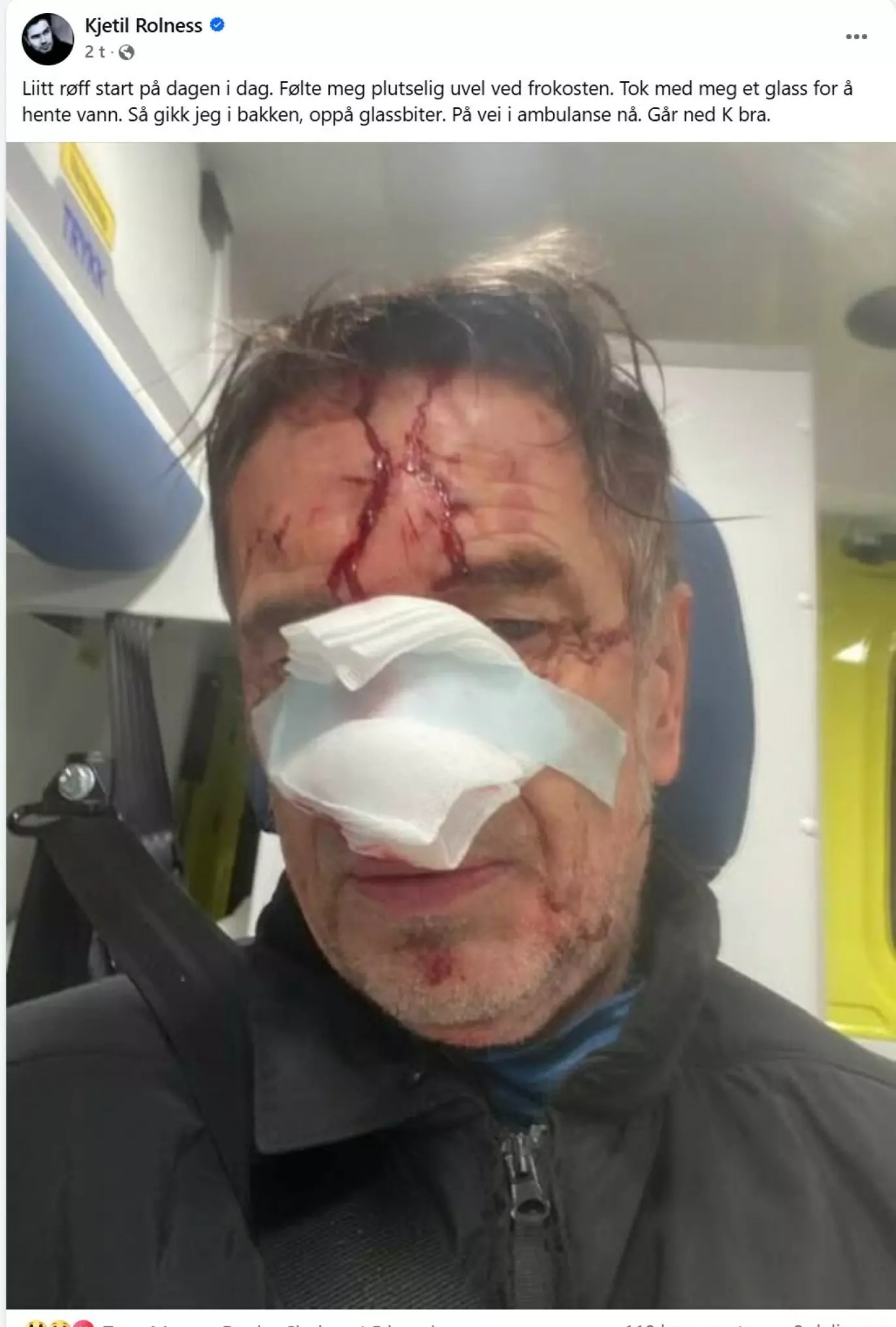 I innlegget beskriver Rolness hvordan han gikk rett i bakken og landet oppå glassbiter. Da meldingen ble publisert tidlig på formiddagen, befant han seg allerede i ambulanse på vei videre for oppfølging.