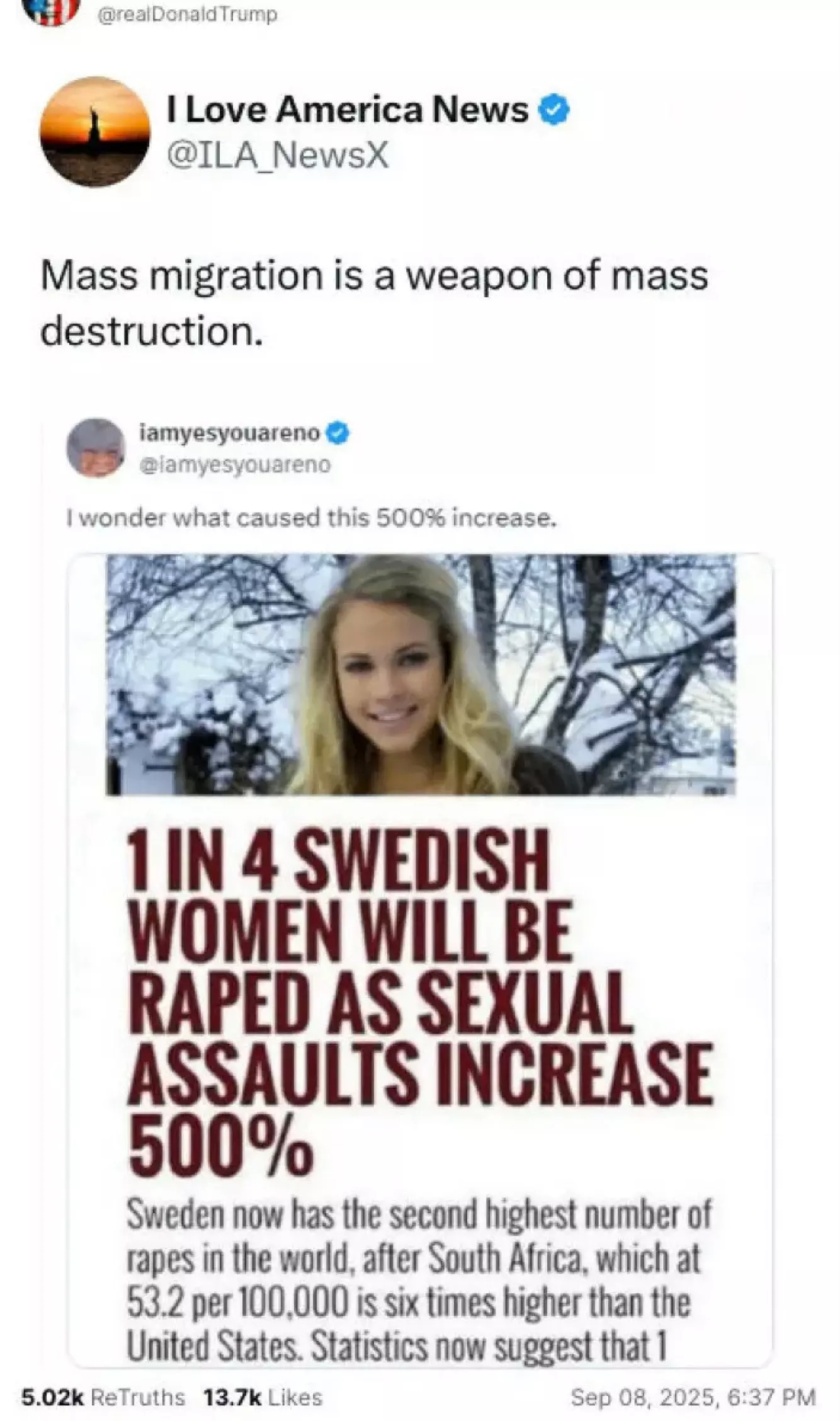Innlegget dukket opp på Trumps egen plattform Truth Social i september. Det hevdet blant annet at voldtekter i Sverige har økt dramatisk, og brukte et bilde av Nereng for å forsterke budskapet. Bildet er av henne som 14-åring og har ingen kobling til påstandene som ble fremmet.