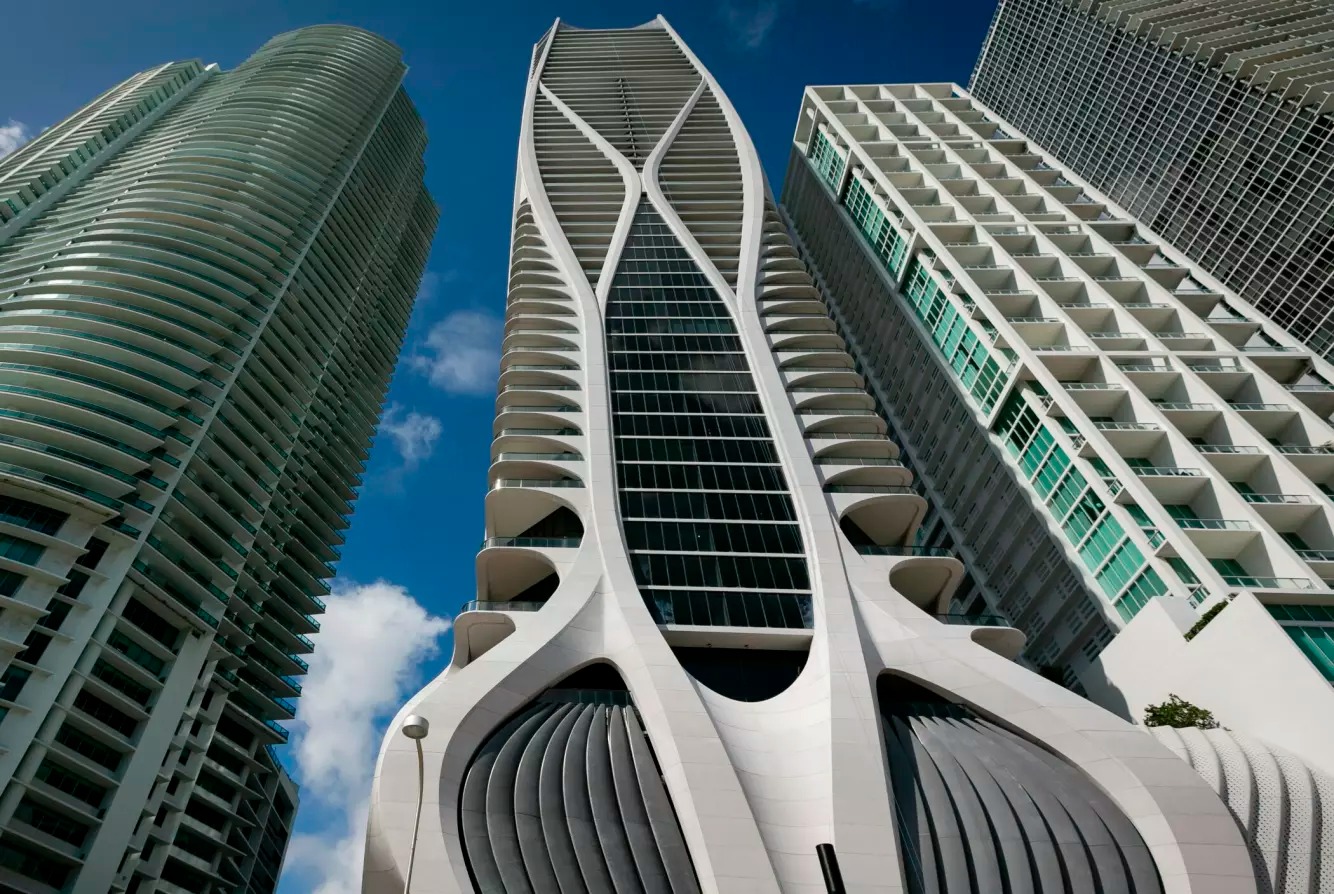 Penthouse-leiligheten ligger i 59. etasje i den ikoniske One Thousand Museum-bygningen, en av Miamis høyeste og mest iøynefallende bygninger. Med sine 62 etasjer og 215 meters høyde ruver bygget over byen – og byr på noe helt unikt: Miamis første private helikopterplass.