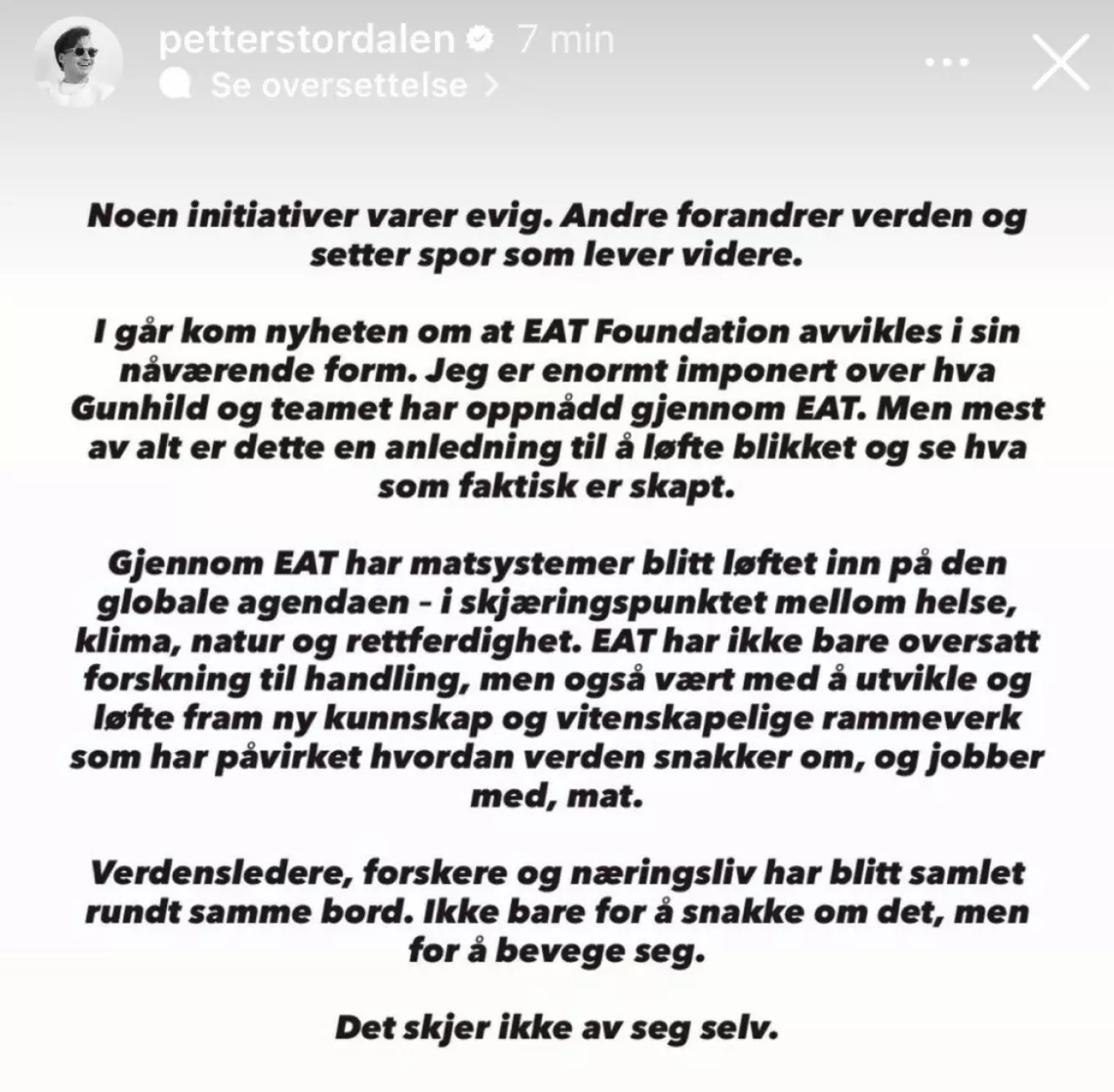I et innlegg delt på Instagram trekker han frem at noen initiativer lever videre i årevis, mens andre endrer verden og etterlater spor. Han beskriver seg som dypt imponert over det Gunhild Stordalen og teamet rundt henne har fått til gjennom EAT, og oppfordrer til å løfte blikket og se resultatene fremfor avslutningen.