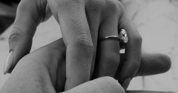 På flere av bildene viser modellen også frem forlovelsesringen hun nå bærer. Ringen består av en stor diamant plassert i en enkel gullring, og Blondeau holder hånden frem foran kamera med et tydelig smil.