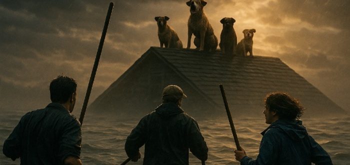 Den dagen sto solen lavt og reflekterte seg i det grumsete vannet som fylte gatene. Lukten av fuktighet og bensin hang i luften, og planker, plastflasker og veltede